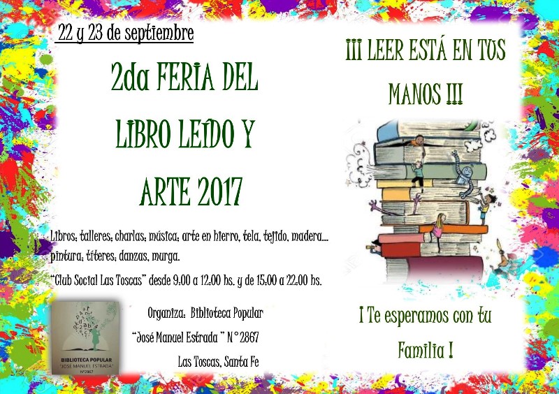 Invitan a la 2ª Feria del Libro leído y Arte» a realizarse los días viernes 22 y sábado 23 de septiembre en el Club Social Las Toscas.
