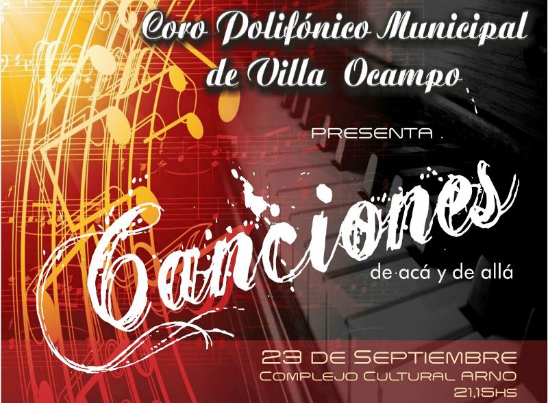 Invitan a presenciar el espectáculo “Canciones de Acá y de Allá”, a cargo del Coro Polifónico Municipal de Villa Ocampo, que se llevará a cabo este sábado 23 de setiembre, a las 21,15 horas en la sala principal del Complejo Arno.