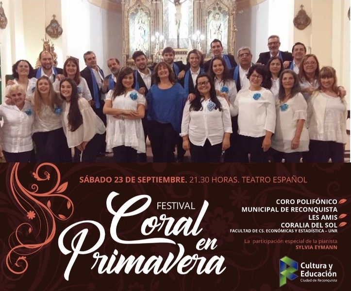 Organizado por la Secretaría de Cultura y Educación de la Municipalidad de Reconquista a través del Coro Polifónico Municipal “Profesor Dionisio Cantero”, el concierto contará con la participación del CORO POLIFÓNICO MUNICIPAL “Prof. Dionisio Cantero” (Reconquista, Santa Fe), CORALIA DEL SOL – Coro de la Facultad de Ciencias Económicas y Estadística, Universidad Nacional de Rosario (Rosario, Santa Fe) y CORAL LES AMIS (Resistencia, Chaco). Junto a los coros, se presentará además la prestigiosa pianista y pedagoga Profesora Sylvia Eimann, de Rosario, que acompañará a los artistas en diferentes interpretaciones para coro y piano.