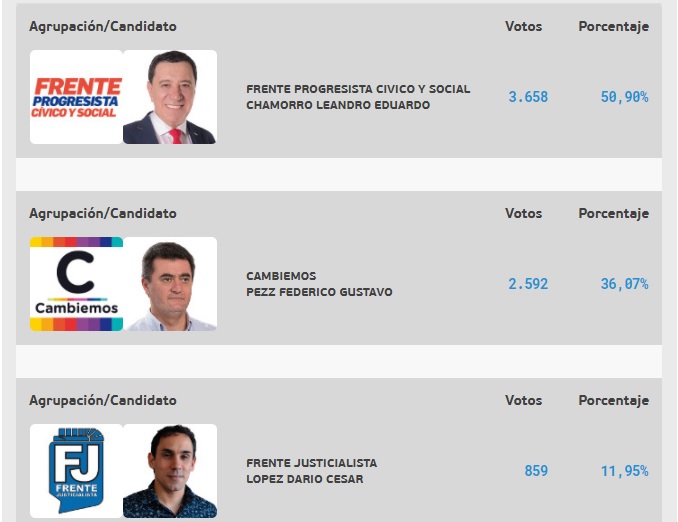 Leandro Chamorro (FPCyS) retuvo la intendencia por amplia diferencia de votos, 3.658 (50,90%), mientras que Federico «Firi» Pezz (Cambiemos) obtuvo 2.592 (36,07%) y el candidato del FJ, César López solamente 859 votos (11,95%).