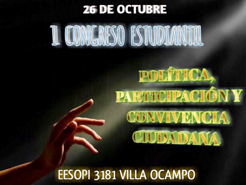 La E.E.S.O.P.I. Nº 3181 “Gral. Manul Obligado” junto al Centro de Estudiantes invitan al 1°Congreso de Estudiantes Secundarios “Política, Participación y Convivencia ciudadana”, evento de trascendencia educativa que se llevará a cabo el 26 de octubre del corriente en las instalaciones del Instituto General Manuel Obligado y reunirá a estudiantes de 18 escuelas secundarias de la zona, el cual dará comienzo con la acreditación a las 09.00 y concluirá a las 16.00 horas estimativamente.