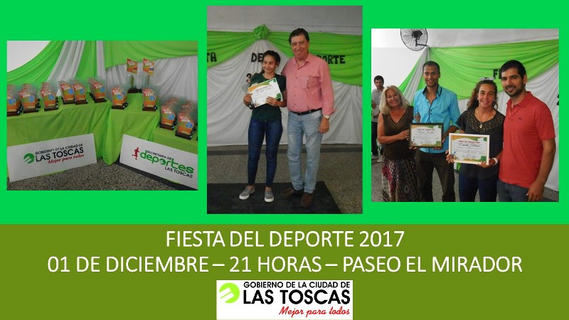 Desde el gobierno de la ciudad de Las Toscas, enviaron las invitaciones para la «Fiesta del Deporte» y el Cierre de los «Talleres Municipales» de la Casa de la Cultura que se realizarán los próximos 01 y 03 de Diciembre respectivamente.