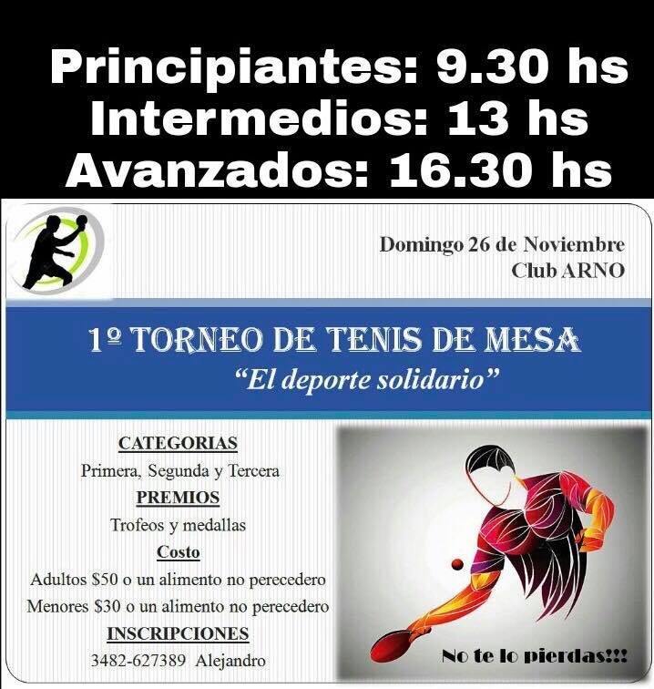 La Dirección de Deportes de la Municipalidad de Villa Ocampo invita al 1º Torneo de Tenis de Mesa “El Deporte Solidario” que se va a realizar este domingo 26 de noviembre en el Complejo “Arno”, organizado en forma conjunta con la Liga de Tenis de Mesa del Norte Santafesino.