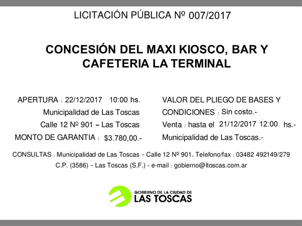 Quien suscribe, Tec. Iván Gastón Sánchez, en carácter de Secretario de Gobierno y Coordinación, de la Municipalidad de Las Toscas, Santa Fe, por intermedio de la presente solicita a usted/s, difundir y/o publicar que se encuentra abierta la Licitación Pública N° 007/2017, a los fines de concesionar la explotación comercial del “Maxi – kiosco, Bar y Cafetería de la Terminal de Ómnibus” de la Municipalidad de Las Toscas, Santa Fe, sita en 102 S/N de la ciudad de Las Toscas.