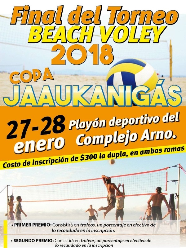 La Dirección de Deportes de la Municipalidad de Villa Ocampo invita a participar de la instancia final del Torneo de Beach Vóley «Copa Jaaukanigás 2018», que se disputará los días sábado 27 y domingo 28 de enero en el playón deportivo del Complejo Arno.