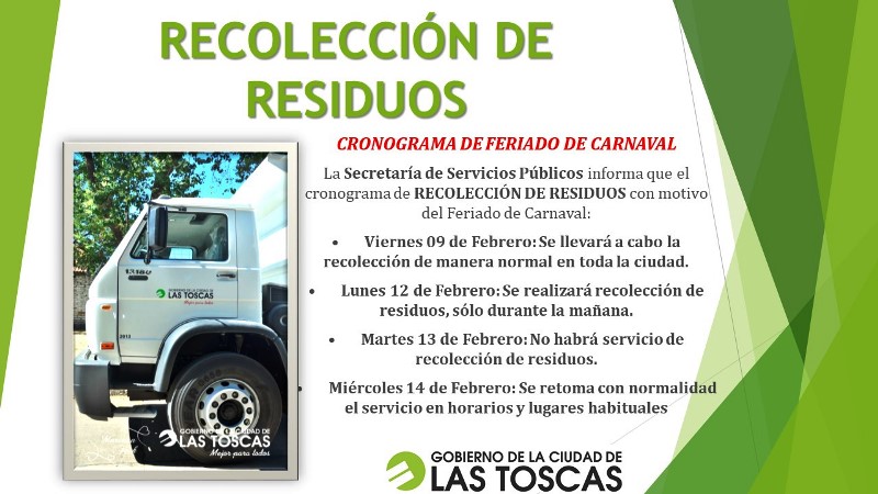 El Gobierno de la Ciudad de Las Toscas, a través de la Secretaría de Servicios Públicos, pone en conocimiento de la comunidad el cronograma de recolección de residuos sólidos urbanos, según el calendario limitado por los feriados de carnaval.