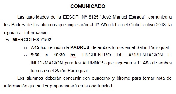 DestacadasEducativas Las Toscas: Comunicado para padres de alumnos que ingresan al 1º Año del en el Ciclo Lectivo 2018 15 febrero, 2018 Compartir en Facebook Compartir en Twitter tweet Las autoridades de la EESOPI Nº 8125 “José Manuel Estrada” de la ciudad de Las Toscas, comunican a los Padres de los alumnos que ingresarán al 1º Año del en el Ciclo Lectivo 2018.