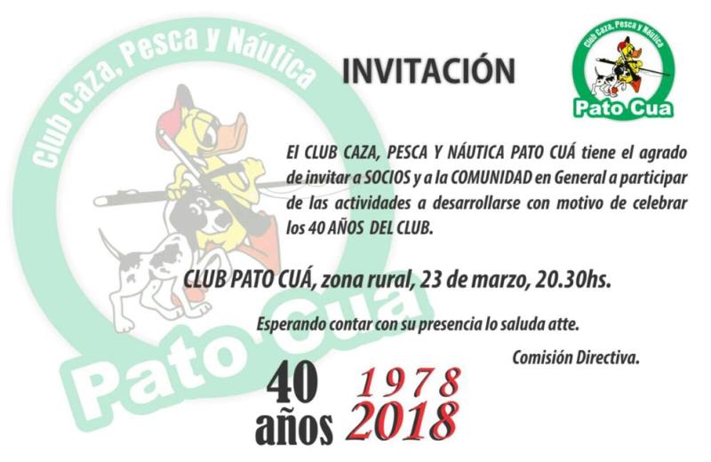 La Comisión Directiva del club de caza, pesca y náutica de la ciudad de Las Toscas, Pato Cuá, invita a toda la comunidad a festejar sus 40 años donde se desarrollarán diversas actividades.