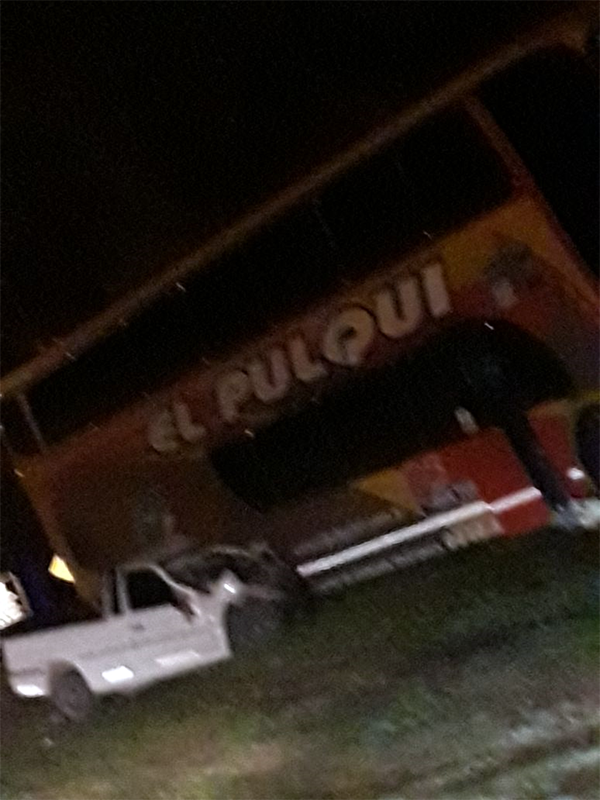 Por causas que se investigan, en el KM 79 de la ruta provincial Nro. 1, colisionaron un ómnibus de pasajeros perteneciente a la empresa El Pulqui y una pick-up Volkswagen Saveiro conducida por una mujer de 50 años de edad domiciliada en la localidad de Campo del Medio, quien perdió la vida en el acto.