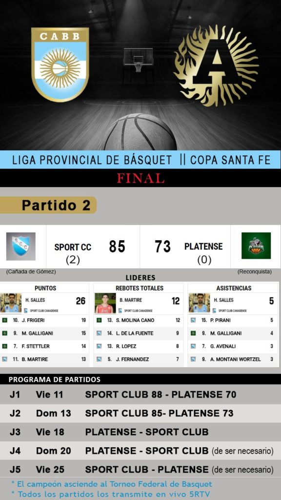 En el Estadio Florencio Verni de Cañada de Gómez, el dueño de casa volvió a vencer a Platense al igual que el viernes, esta vez por 85 a 73, y de esta manera lidera con dos victorias la serie final de la Copa Santa Fe, que concede el ascenso al Torneo Federal de Basquet.