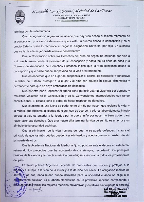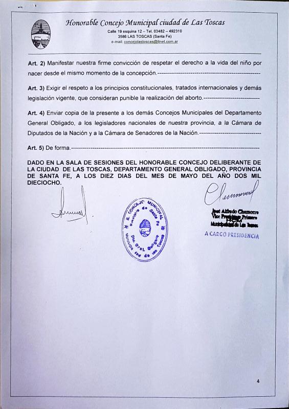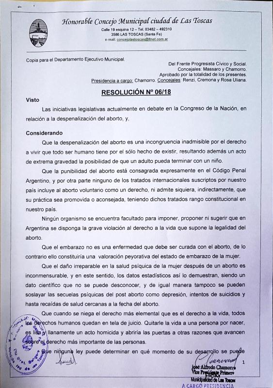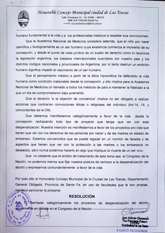 En el mismo sentido, el intendente de Las Toscas, Dr. Leandro Chamorro, manifestó “estar totalmente de acuerdo con esta resolución del Concejo Deliberante y acompaño la decisión de manifestarse en contra de este proyecto de Ley. Por ello he realizado el Decreto 015/2018 donde adhiero completamente a los artículos que allí se han redactado, y sumo mis convicciones a las de los concejales en favor de la vida”.