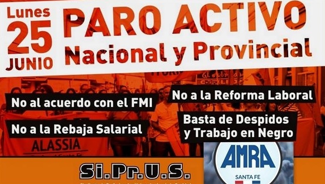 El paro nacional del lunes afectará también la atención en los hospitales y demás centros públicos de salud, ya que adhieren tanto AMRA como SIPRUS, en protesta contra la política económica del gobierno nacional. El Sindicato de Médicos de la República Argentina (AMRA) Seccional Santa Fe informó que adhiere al paro convocado por la CGT Nacional alcanzando tanto a la actividad pública como a la privada, garantizándose las guardias mínimas y la atención de las urgencias.