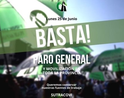La Comisión Directiva de SUTRACOVI, tomo la decisión de acompañar el Paro General de 24 horas, convocado por la CGT Nacional, para el día 25 de junio del corriente año.