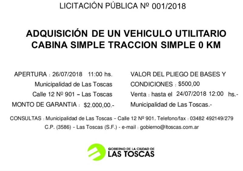 RECEPCIÓN DE OFERTAS hasta el 26 de julio de 2018 a las 10,45 hs. en la MUNICIPALIDAD DE LAS TOSCAS – Calle 12 Nº 901 – C.P. 3586 – Las Toscas – Pcia de Santa Fe – Tel.fax: (03482) 492279 / 149.