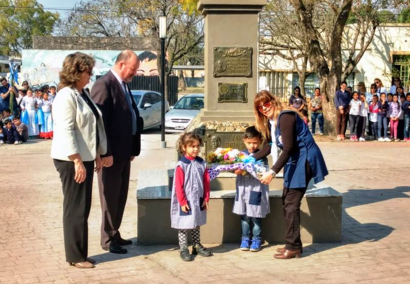 Luego, depositaron en el monumento al General San Martín, una ofernda de gratitud, sombolizadas en unas flores, que fueron concretadas por el intendente Enrique Paduán, la diputada Estela Yaccuzzi y la directora Zulma Romero, del Jardín Nº 78 «José María Da Silva».