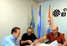 El acto, tuvo su comienzo con el izamiento de las banderas nacional, provincial y municipal de la mano del intendente Paduán, Cristian Peirone, director del CAEB y María del Carmen Perrotta, presidenta de la Biblioteca Jorge Capello.