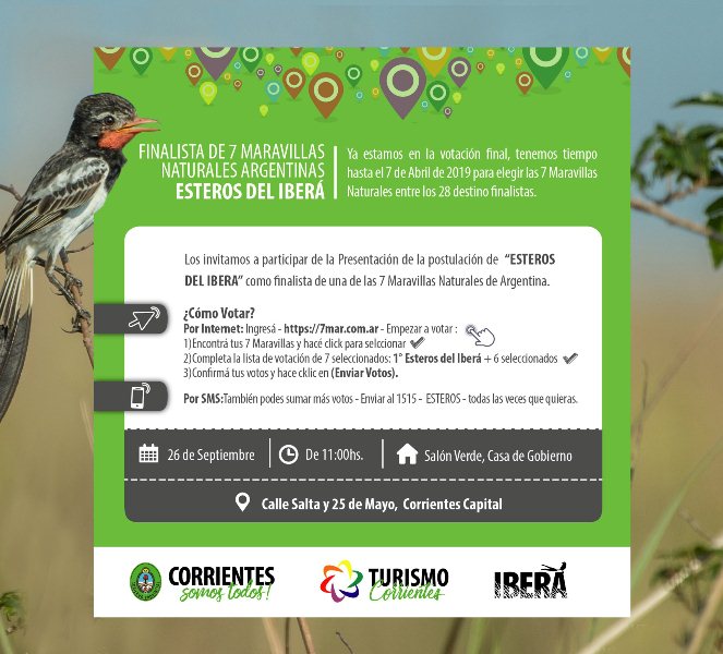 El Ministerio de Turismo de Corrientes, en una acción articulada con la Dirección de Información Pública del Gobierno Provincial ya se encuentran preparando una serie de acciones de difusión a través de múltiples plataformas para motivar a que, a través de los votos del público, Esteros del Iberá se convierta en una de las 7 Maravilla Naturales de Argentina.