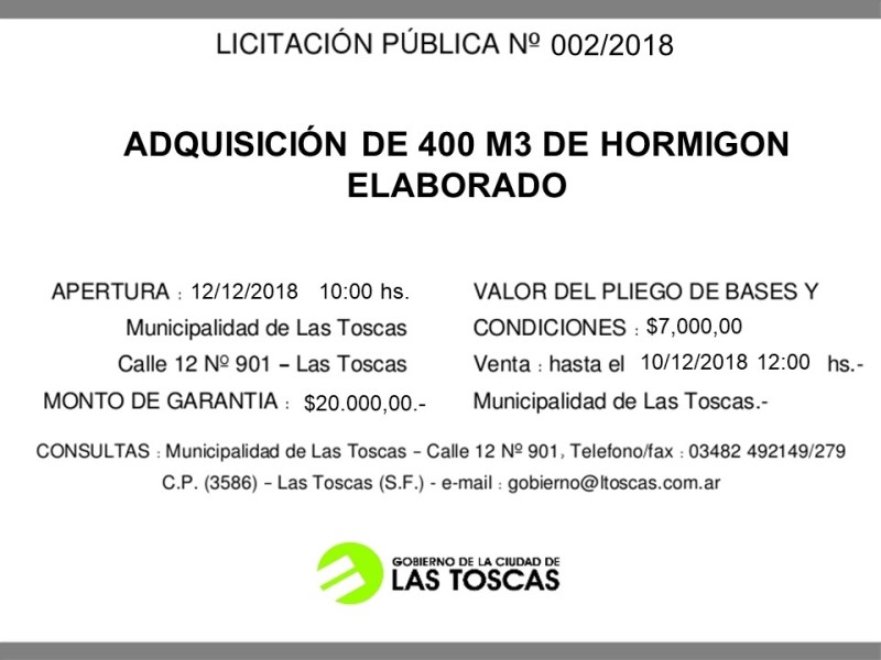 La Municipalidad de Las Toscas llama a Licitación Publica N° 002/2018, para la adquisición de 400 m3 de hormigón elaborado H25, siendo el día fijado para la apertura de ofertas el 12 de diciembre de 2018 a las 10 hs., en la sala de conferencias de la municipalidad.