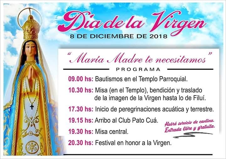 – 10.30 horas: Misa en el Templo, bendición de embarcaciones y traslado de la imagen de la Virgen hasta lo de Filuí.