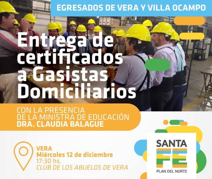 El intendente Enrique Paduán informa que este miércoles 12 de diciembre, a las 17:30 horas en el Club de Abuelos de Vera, con la presencia de la ministra de Educación de la Provincia, Claudia Balagué, se realizará el acto de entrega de certificados a los gasistas domiciliarios que realizaron el curso este año en esa localidad y en la Escuela Técnica 619 de Villa Ocampo.