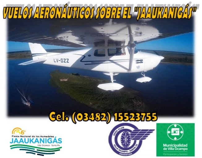 La Secretaría de Cultura y Comunicación de la Municipalidad de Villa Ocampo informa que, en adhesión a la 6º Fiesta Nacional de los Humedales, el Aero Club Villa Ocampo ofrecerá vuelos aeronáuticos a precio promocional sobre el Sitio Ramsar Jaaukanigás (zona de islas y ríos) el viernes 1º, sábado 2 y domingo 3 de febrero.