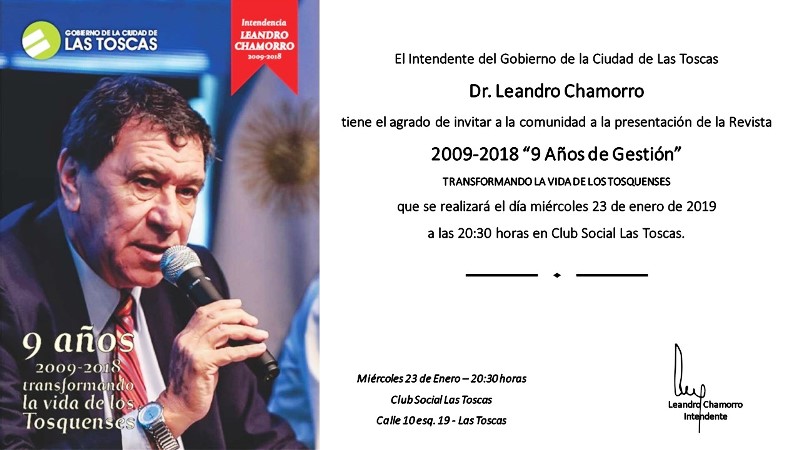 Durante el acto se realizará una síntesis de los 9 años de gestión de Leandro frente a la Intendencia de Las Toscas, periodo 2009 – 2018, y se presentará una revista con un resumen de todo lo concretado.