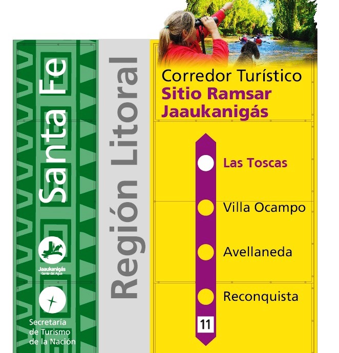 Dicho corredor turístico también presentará carteles de señalización sobre flora y fauna de Jaaukanigás en las ciudades de Reconquista, Avellaneda y Villa Ocampo, mediante un convenio firmado por cada municipio con el Ministerio de Turismo de la Nación, a través de la Secretaría de Turismo de la Provincia de Santa Fe.