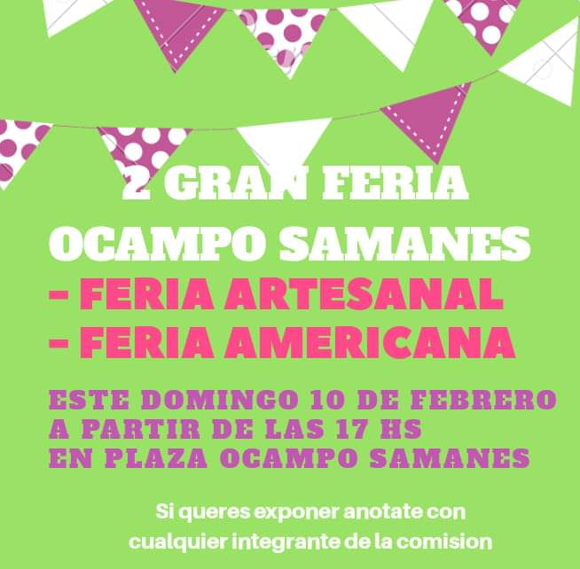 La Secretaria de Cultura y Comunicación invita a participar de la 2° Gran Feria Artesanal y Americana el día domingo 10 de febrero a partir de las 17.00 hs en la plaza Ocampo Samanes.