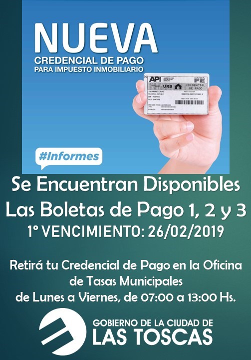 El Gobierno de la Ciudad de Las Toscas a través de la Secretaría de Hacienda y Control Tributario, informan que ya están disponibles las boletas de pago del Impuesto Inmobiliario Urbano y Rural, correspondientes a las Cuotas 1, 2 y 3 del corriente año; cuyo primer vencimiento comienza a operar a partir del 26 de febrero próximo.