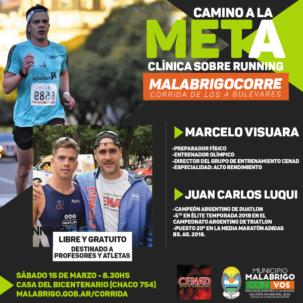 La Dirección de Deportes de la Municipalidad de Malabrigo en el marco de #MalabrigoCorre2019 llevará adelante una Clínica sobre Running destinada a todos los atletas, corredores y profesores de nuestra región con el fin de adquirir nuevos conocimientos y experiencias a partir de la presencia de un importante entrenador y un atleta de elite.