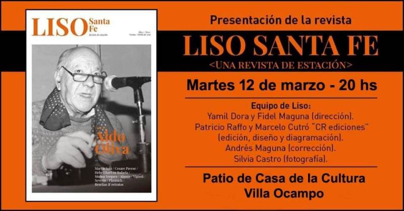 La Secretaría de Cultura y Comunicación de la Municipalidad de Villa Ocampo y el grupo VOCES (Villa Ocampo Escribe) invitan a la presentación en nuestra ciudad de la revista cultural «Liso Santa Fe», el martes 12 de marzo, a las 20:00 Hs. en el patio-jardín de la Casa de la Cultura «Raúl Scalabrini Ortiz».