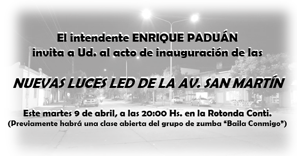 El intendente Enrique Paduán invita al acto de inauguración de la nueva iluminación Led de la Av. San Martín, que se llevará a cabo mañana martes 9 de abril, a partir de las 20:00 Hs. en la Rotonda Conti. Previamente, el grupo de zumba «Baila Conmigo» realizará en el lugar una clase abierta de baile.