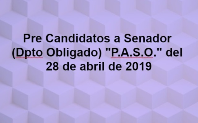 DestacadasPolítica Pre Candidatos a Senador (Dpto Obligado) para las «P.A.S.O.» del 28 de abril de 2019 24 abril, 2019 Compartir en Facebook Compartir en Twitter tweet