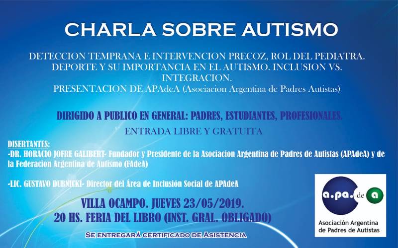 20:00 Hs. Presentación del libro “Autismo. Cuadernos de APAdeA” de Horacio Joffre Galibert.