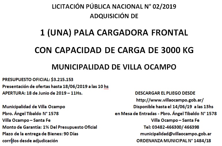 La Municipalidad de Villa Ocampo llama a Licitación Pública Nacional 02/2019 para la adquisición de una pala cargadora frontal con capacidad de carga de 3.000 Kg.; según Ordenanza Municipal 1484/18, con un presupuesto oficial de $3.215.153.