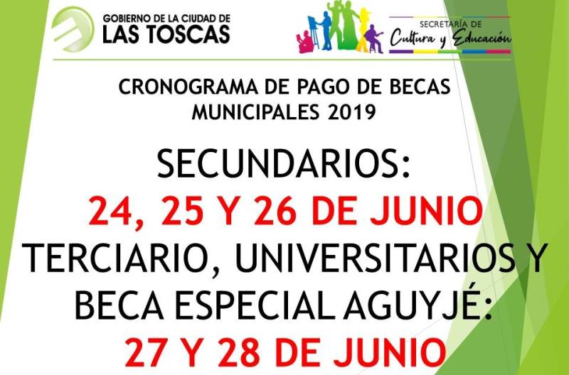 CulturaDestacadas Las Toscas: Cronograma de pago para beneficiarios de BECAS 2019 19 junio, 2019 Compartir en Facebook Compartir en Twitter tweet La Secretaría de Cultura y Educación del gobierno de la ciudad de Las Toscas brinda información para todos aquellos beneficiarios de las BECAS 2019 y además informa su Cronograma de Pago.