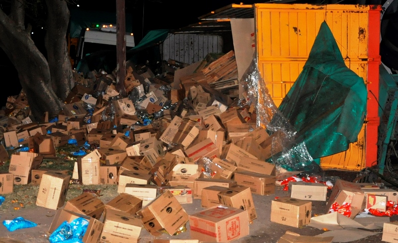 La mercadería quedó dispersada a ambos laterales de la ruta y luego del reconocimiento del seguro, algunos vecinos comenzaron a llevar dulces, golosinas y otras cosas.