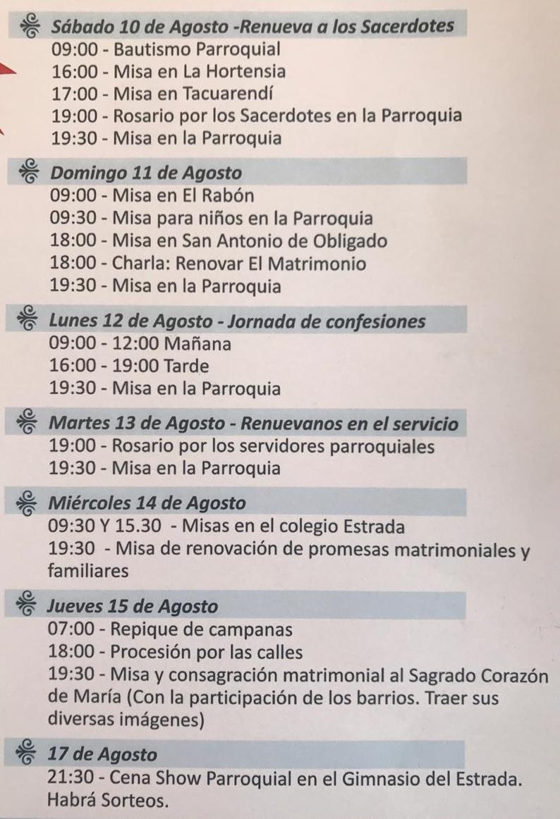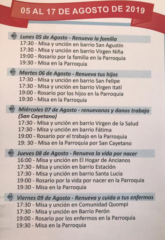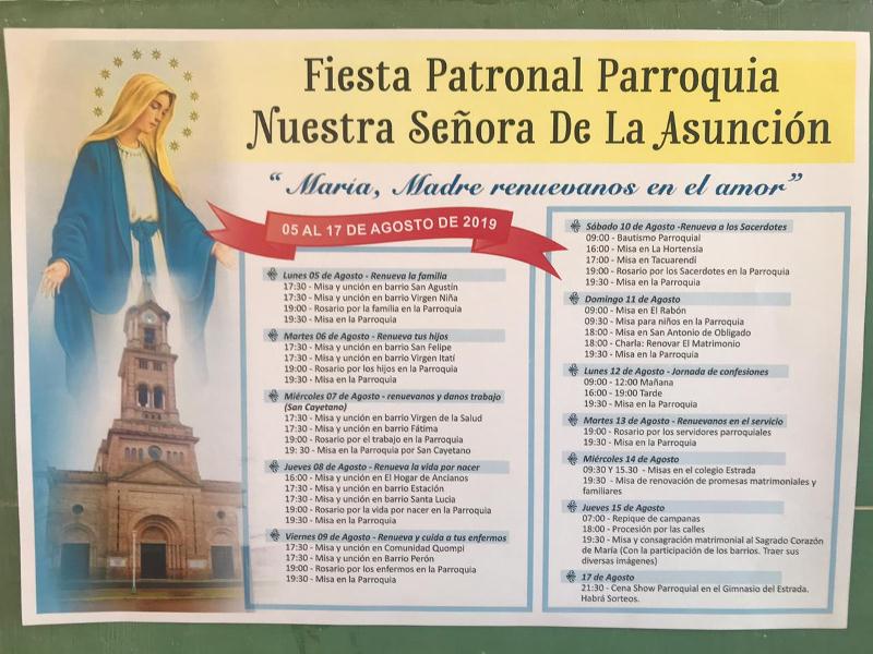 La misma se llevará a cabo del 5 al 17 de agosto con diferentes misas en varias parroquias de la ciudad y de la región. Como también el bautismo parroquial, una charla sobre renovar el matrimonio, jornadas de confesiones y el cierre con una Cena Show Parroquial en el Gimnasio del Estrada donde habrá sorteos.