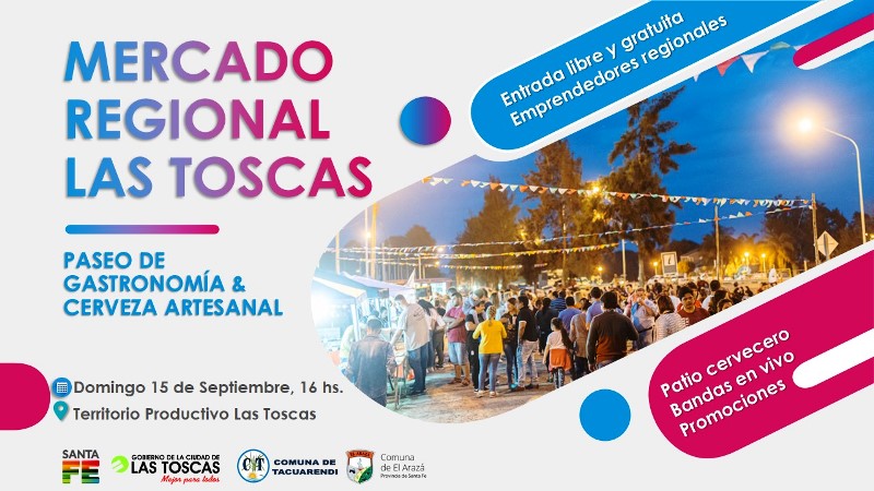 El próximo domingo 15 de septiembre el Territorio Productivo Las Toscas, nuevamente, se viste de fiesta: se presenta el “Mercado Regional Las Toscas”. Allí, a partir de las 16 hs., se podrá disfrutar de un gran mercado a cielo abierto con emprendedores de toda la región, precios accesibles y producciones artesanales.
