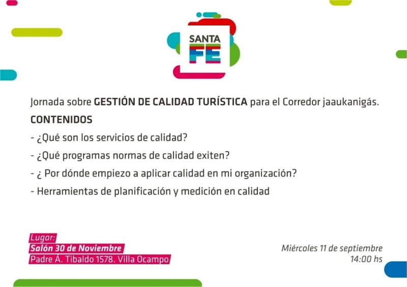 La Municipalidad de Villa Ocampo junto a la Secretaría de Turismo de la Provincia invitan a todos los prestadores de servicios relacionados con la actividad turística (hoteleros, gastronómicos, transportes de pasajeros, guías, cámaras que los agrupa, etc.) de toda la Región Jaaukanigás a participar de una jornada sobre «Gestión de Calidad Turística».