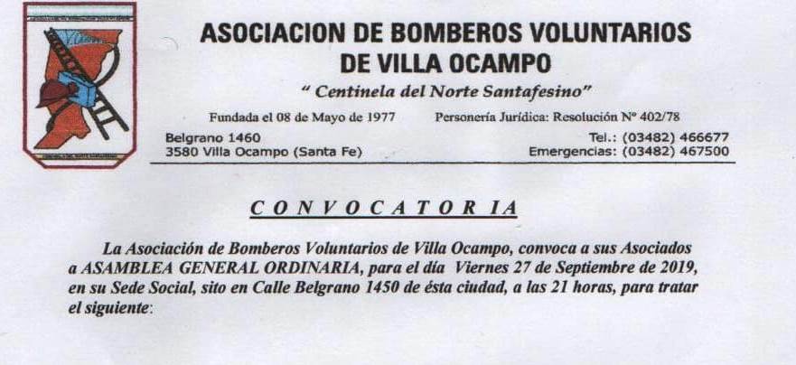 Destacadassociales Asociación Bomberos Voluntarios: Convocatoria a Asamblea 12 septiembre, 2019 Compartir en Facebook Compartir en Twitter tweet La asociación de Bomberos Voluntarios de Villa Ocampo, convoca a sus asociados a la Asamblea General ordinaria, para el día viernes 27 de setiembre de 2019 en su sede social, sito en calle Belgrano 1450 de esta ciudad, a las 21 horas. ORDEN DEL DÍA La convocatoria completa es la siguiente