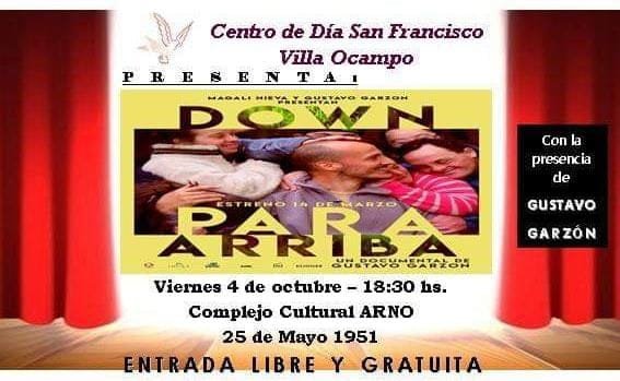La Secretaría de Cultura y Comunicación de la Municipalidad de Villa Ocampo invita a la presentación del documental “Down para Arriba”, con la presencia de su director Gustavo Garzón, este viernes 4 de octubre a las 18:30 Hs. en la Sala Bordó del Complejo “Arno”; con entrada libre y gratuita. El reconocido actor acompañará la exhibición del audiovisual y luego realizará un intercambio con la audiencia.