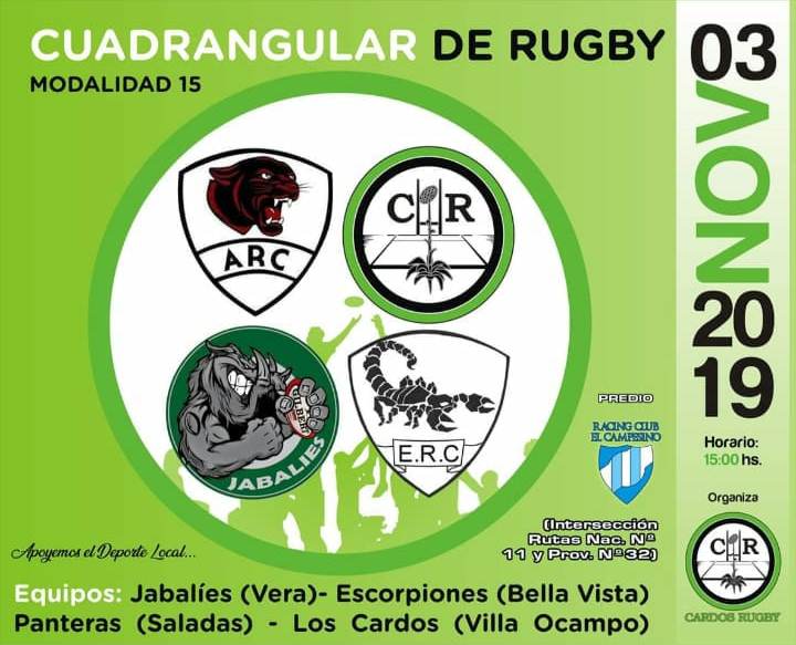 El domingo 3 de noviembre se realizó el torneo cuadrangular de rugby, modalidad 15 en Racing Club El Campesino, donde jugaron Los Cardos de Villa Ocampo, quienes resultaron campeones.