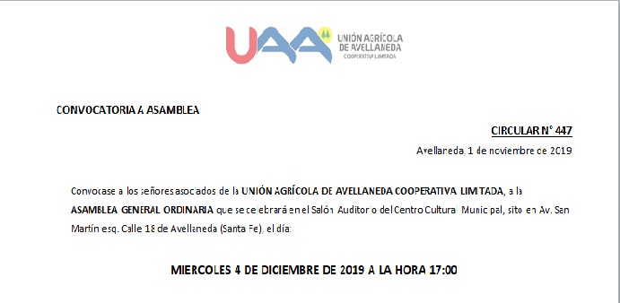 Convocase a los señores asociados de la UNIÓN AGRÍCOLA DE AVELLANEDA COOPERATIVA LIMITADA, a la ASAMBLEA GENERAL ORDINARIA que se celebrará en el Salón Auditorio del Centro Cultural Municipal, sito en Av. San Martín esq. Calle 18 de Avellaneda (Santa Fe), el día:
