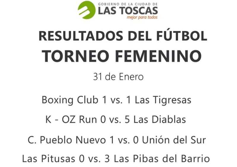 En la noche del viernes 31 de enero, dio inició el Torneo de Fútbol Femenino organizado por la Secretaría de Deporte del Gobierno de la Ciudad de Las Toscas. Contó con la inscripción de 9 equipos y la participación de 144 jugadoras.