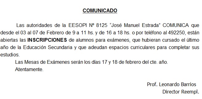 Las autoridades de la EESOPI Nº 8125 “José Manuel Estrada” COMUNICA que desde el 03 al 07 de Febrero de 9 a 11 hs. y de 16 a 18 hs. o por teléfono al 492250, están abiertas las INSCRIPCIONES de alumnos para exámenes, que hubieran cursado el último año de la Educación Secundaria y que adeudan espacios curriculares para completar sus estudios.
