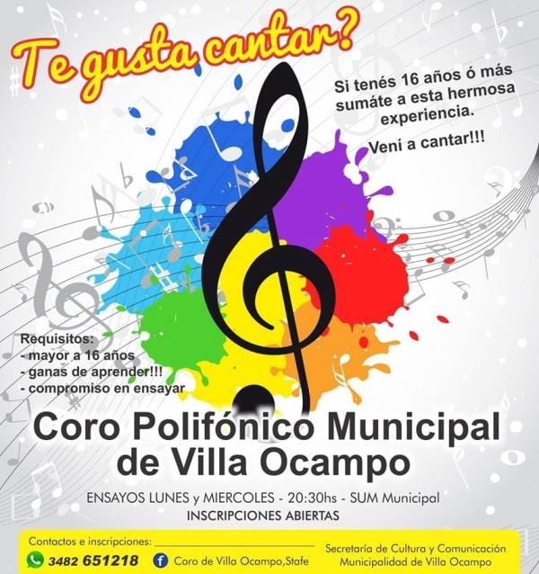«ESTÁN ABIERTAS LAS INSCRIPCIONES PARA PARTICIPAR DEL CORO POLIFÓNICO MUNICIPAL», informaron desde la Secretaría de Cultura y Comunicación de la Municipalidad de Villa Ocampo, quienes invitan a participar en forma gratuita del Coro Polifónico Municipal, para mayores de 16 años (voces masculinas o femeninas) con ganas de aprender a cantar y compromiso para ensayar.
