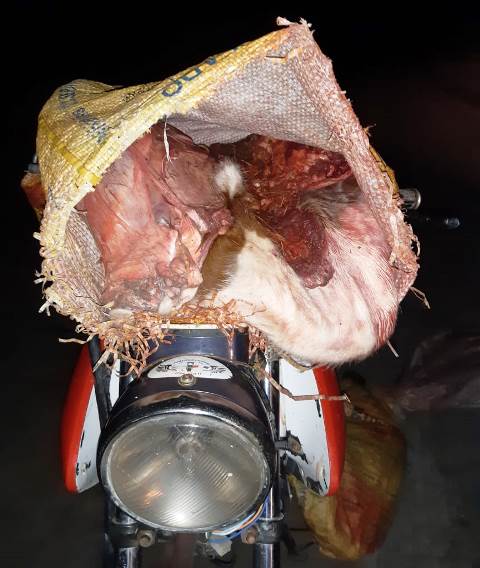 Fecha 30-03-2020- Personal Comisaria VIII UR IX circunstancias que realizaba patrullaje preventivo fines desalentar delitos, contravenciones y/o Decreto de necesidad y Urgencia DNU 260/2020 del Poder Ejecutivo Provincial en relación DNU 297/2020 del Poder Ejecutivo Nacional, se intercepto a dos masculinos identificados como J.I.S., 25 años de edad, domiciliado este medio y M.C.A., 23 años de edad, domiciliado en ese medio, quienes circulaban en una motocicleta marca ZANELLA 150 c.c. color blanca y roja, trasladando sobre la misma tres bolsas de color blanca de Nylon las cuales contenían en su interior productos carneos con cuero discriminados (paletas, cuarto y costillar) haciendo un total aproximado de 80 kilogramos, no pudiendo justificar procedencia, por lo que se procedió a su aprehensión y secuestros de elementos descriptos. Siendo las 06:00 horas se hizo presente personal D.G.S.R. LOS PUMAS con asiento en la ciudad de Villa Ocampo fines prestar colaboración.