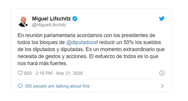 A través de su cuenta de Twitter, el ex gobernador de la provincia anunció la rebaja de los sueldos de los y las Diputadas provinciales en el marco de la emergencia sanitaria por la pandemia de Covid-19 en todo el territorio nacional.