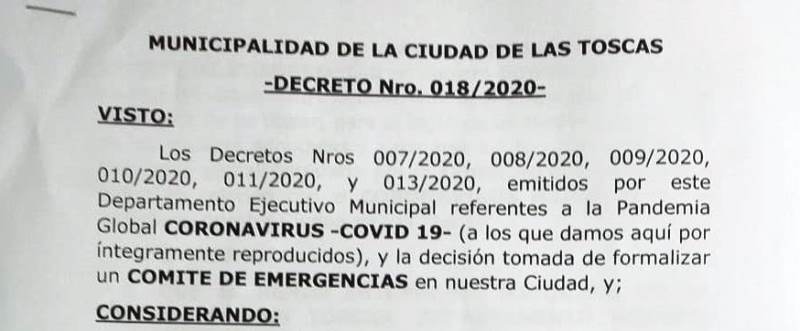 El intendente de Las Toscas, Leandro Chamorro convocó a las principales instituciones de la ciudad para formalizar la creación de un comité de emergencias, la reunión tuvo lugar en la sala de conferencias de la institución municipal este lunes 30 de marzo.